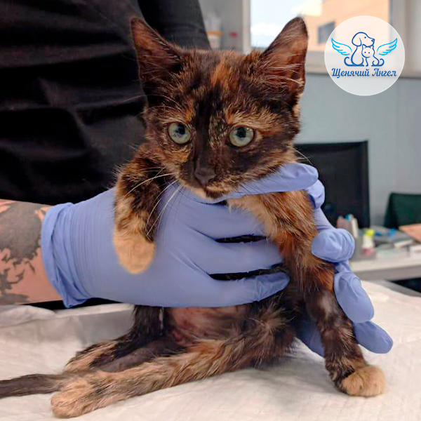 Котёнка подбросили в картонной коробке 📦 к торговым рядам в Ольгинке. Малышка не могла опираться на задние лапки, а глазки и носик были залиты гноем 🥺.